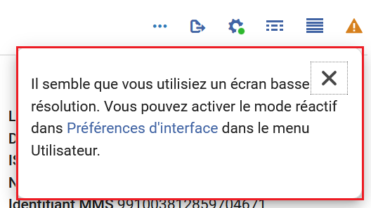 Si vous utilisez un écran basse résolution et que vous souhaitez accéder à la vue divisée, un message d’Alma s’affiche et vous invite à activer le mode d’écran réactif dans les paramètres :