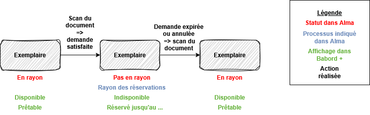 Lorsque la demande est expirée ou annulée, le statut de l’exemplaire est toujours « Pas en rayon ». Une fois le document scanné, l’exemplaire repasse en rayon ; il est de nouveau affiché disponible et prêtable dans Babord+.
