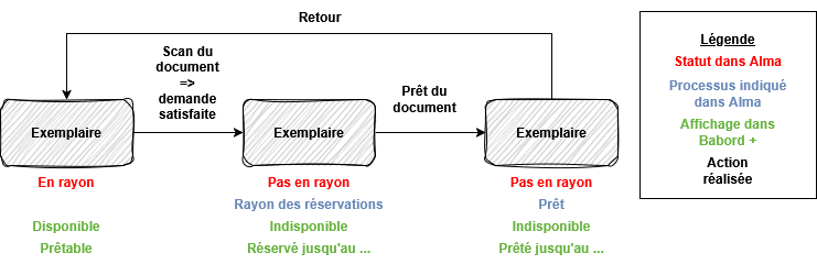 L’exemplaire est en rayon. Une fois le document scanné pour satisfaire la demande, il prend le statut « Pas en rayon » dans Alma : il passe alors sur le rayon des réservations. Dans Babord+, ilest indiqué indisponible et réservé jusqu’au …