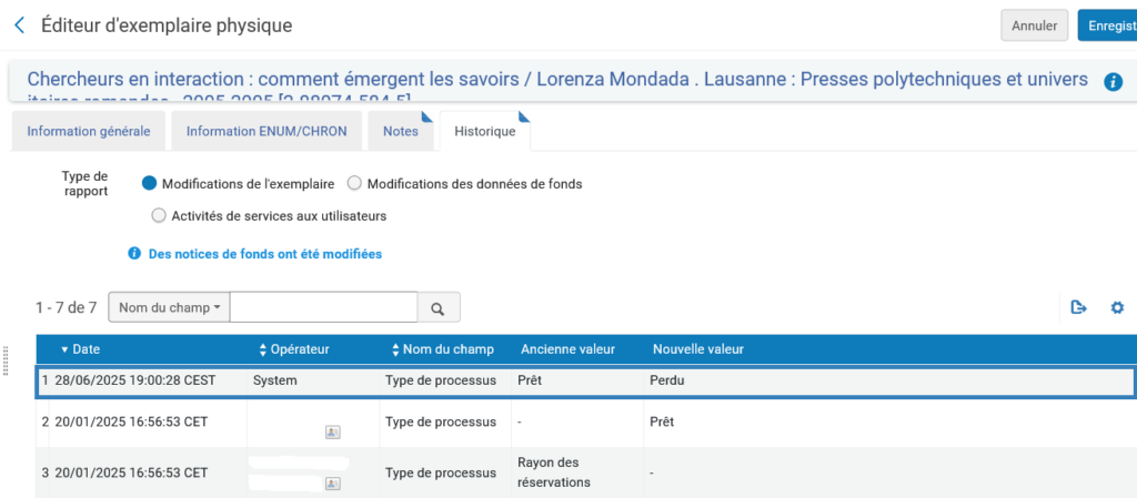 • Visualisation de l’historique de l’exemplaire en cliquant sur le code-barres de l’exemplaire (affichage dans l’éditeur d’exemplaire physique) :