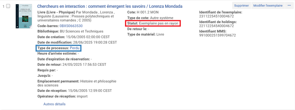 • L’exemplaire n’est pas rendu par le lecteur et doit donc être remboursé, l’exemplaire dans Alma sera supprimé et éventuellement racheté ;