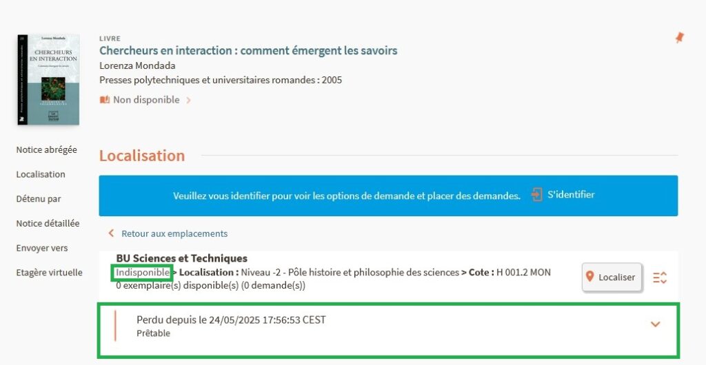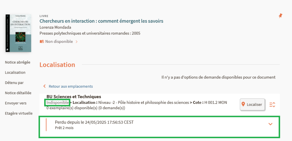 En cas de retard supérieur à 30 jours (à l’issue du 3e rappel), l’exemplaire reste sous le statut « Pas en rayon » et le processus indiqué est perdu. L’affichage dans Babord+ indique que l’exemplaire est indisponible et qu’il est perdu depuis le …