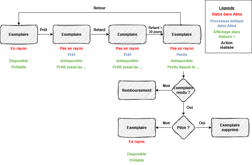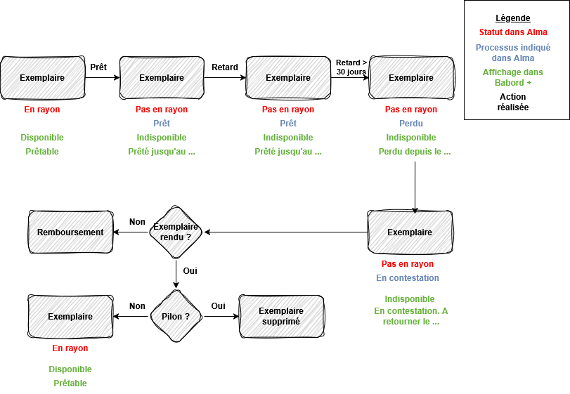 Pour mieux visualiser les différentes situations d’un exemplaire dans Alma et dans Babord+, nous avons représenté les étapes sous forme de schémas. En cas de blocage, le statut de l’exemplaire dans Alma, le processus indiqué, l’affichage visible dans Babord+, permettent de repérer où se situe chaque exemplaire et d’identifier l’action suivante dans le circuit.