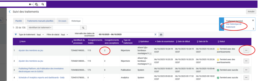 Dans les deux cas, cliquez sur le lien pour accéder à la liste des traitements (celle-ci est aussi accessible via le menu Admin > Gérer les traitements et les ensembles > Suivi des traitements)