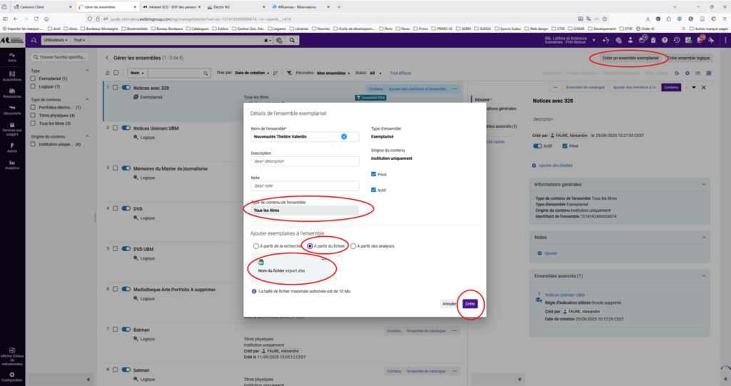 Créer un ensemble dans Alma :