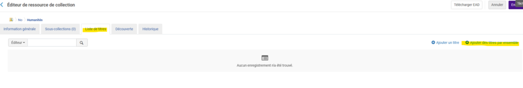 A partir de la sélection, sélectionnez l’onglet Liste des titres et cliquer sur Ajouter des titres par ensemble. Sélectionnez ensuite le jeu de résultats précédemment créé et cliquez sur Ajouter un ensemble de titres.